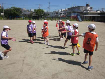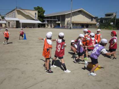 「くねくねリレー」「ぐるぐるリレー」「ピョンピョンリレー」「折り返しリレー」と,いろいろなリレーに取り組んできた子どもたち。学習の最後の時間には,次の学年の活動へつなぐために,「スクエアリレー」に挑戦です。野球のダイヤモンドを回っていくように,置かれた3つのコーンを順に回って,次の人にバトンパスをします。3チームずつの対抗戦を行うと,見ている3チームも応援に力が入ります。競り合うことの楽しさも感じた子どもたちでした。