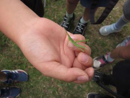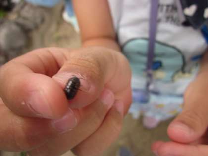 学校にはどんな生き物がいて,どんな生き物が飼えそうか,今日は「小さなともだち」を探しに外へ出ました。「モンシロチョウ」「バッタ」「ダンゴムシ」…。虫が苦手な子どももそうでない子どもも,誰かが何かを見つけるたびに「わぁ〜。」と嬉しそうに駆け寄って見ていました。今日は虫取り網を持って行かなかったのに,赤白帽の中にモンシロチョウを捕らえて,捕まえた本人もビックリでした。