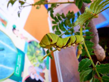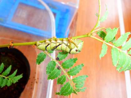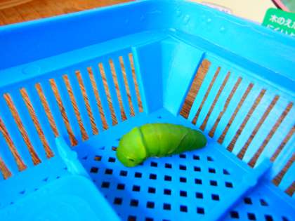 アゲハの幼虫が大きくなってきました。山椒の葉をモリモリ食べています。さなぎになりかけている幼虫もいます。「ぶじに成虫になれるといいな。」と,子どもたちも毎日,見守っています。
