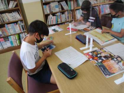 この日は自分の想像を広げ,その世界にありそうなものを図書館にある本をヒントに考えました。図鑑などを使って,「○○があるのもいいね」など友達と話しながら進めていました。