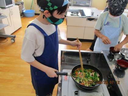 グループで協力して,にんじんやピーマン,たまねぎを切り,油でいためると,家庭科室中とってもいい香りがしました。自分たちで作った「いろどり野菜炒め」は最高においしかったですね!!