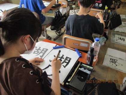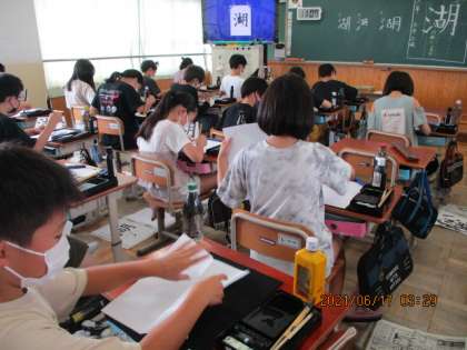6年生の書写では,漢字の3つの部分に気をつけて『湖』という漢字を書いています。