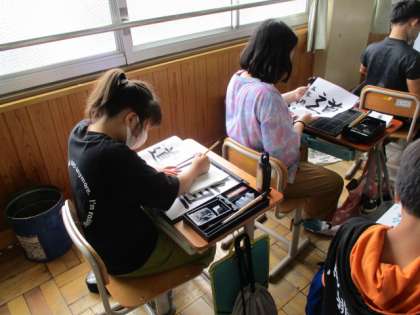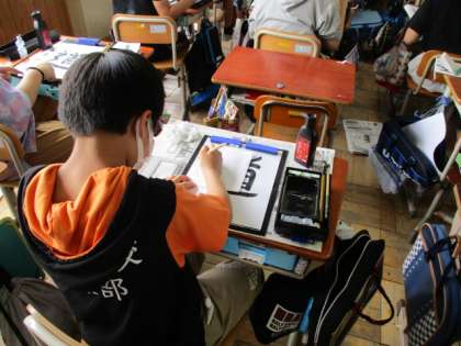 毛筆の学習です。鉛筆で書いても難しい「しんにょう」の書き方を意識して,頑張りました。