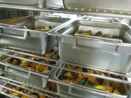 「かぼちゃの煮つけ」はスチームコンベクションオーブンで炊きました。かぼちゃのあま味が感じられ,子どもたちにも好評でした。