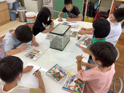 生き物係は,アカハライモリのひめちゃんの水槽をきれいにし,水替えをしました。