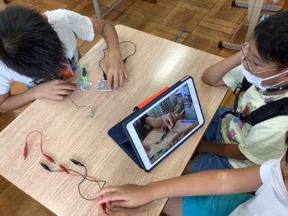 4・5年生は「電池のはたらき」の学習で,回路について学習しました。直列・並列どちらのつなぎ方をすると豆電球が明るくなるかを調べました。調べたことをタブレットで発表しあいました。