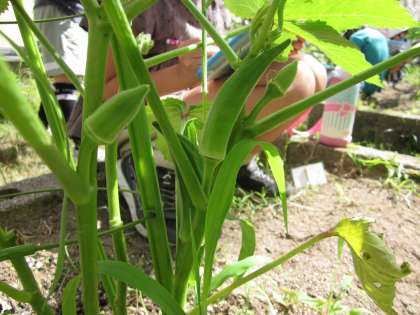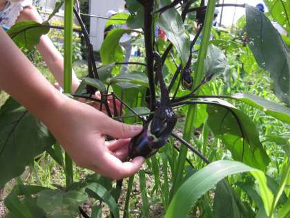 野菜が次々と実り,収穫が始まっています。ふだんスーパーに並ぶ野菜しか見たことのない子どもにとっては,花が咲いた後に実る実の様子に興味深々です。苗から大きく育ち,葉を増やし,花を咲かせ,食べれる野菜が育っていくことをお世話しながら学んでいます。