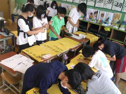 どんな大人になりたいか,将来はどのようになっていたいか,などをテーマに一人一人,言葉を選び,布に書いています。