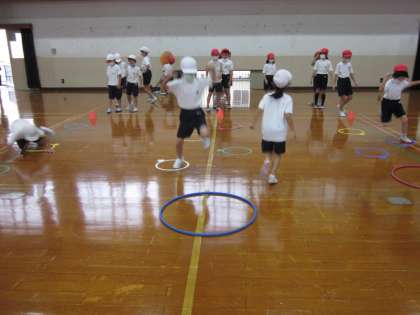 「島」とびあそびをしました。スタートから4つの島を飛び移って,最後に両足で大きな島に着地します。島の外にはサメやワニが泳いでいるつもりで,慎重に島から島へ飛び移っていました。慣れてきたら島と島との間隔を広くしていき,ビッグジャンプにもチャレンジしました。