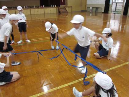 「ゴムとび」は2本のゴムをクロスしてバージョンアップ!反時計回りに次々とゴムを跳び越す動きを楽しみました。