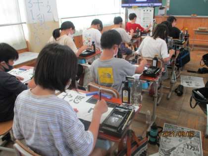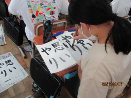 今日の書写の学習では,文字の大きさ,配列,点画のつながりを意識して【思いやり】という字を書きました。
