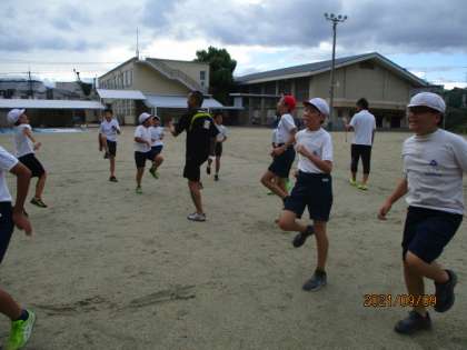 ももを上げて,腕を振って,練習しています。