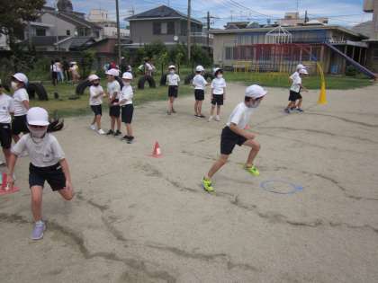 運動場にグループで自分たちが跳ぶ川を作りました。スタートから川に落ちないように飛び越えてゴールを目指します。飛び越えられそうにない幅の所には島を作って跳べるように工夫しました。他のグループが作った川も順番に回って飛び越えて楽しみました。