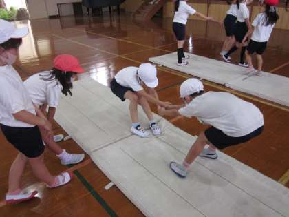 マットを土俵にして,まずは背中合わせの押し相撲をしました。腰を落として,じわりじわりと相手を押し出していきます。対戦相手が変わるたびに新しい気持ちで取り組んでいました。次に,マットを2枚つなぎ合わせて,引っ張り相撲をしました。つないだ手が離れないようにしっかりと握って,相手を引き込みます。1対1の勝負が楽しくて,勝っても負けても笑顔の子どもたちでした。