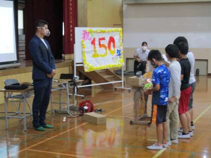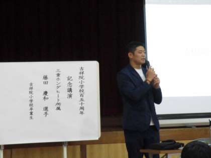 本日5時間目に創立150周年記念講演会を行いました。講師には、本校の卒業生で昨年開催された東京オリンピック7人制ラグビー日本代表選手の藤田 慶和選手がお越しいただきました。コロナ感染予防対策で、体育館には全校児童を代表して6年生が入り、1年生から5年生は各教室でモニターを通してお話しを聞きました。