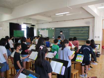 この日の音楽の時間は,キャンプファイヤーの時に歌う「遠き山に日は落ちて」と「もえろよ もえろ」を練習しました。キャンプファイヤーで最高の思い出を作るために,みんなで雰囲気づくりをがんばることを約束しました。