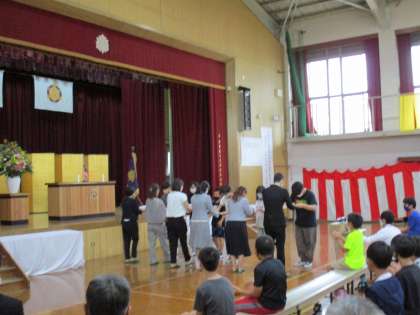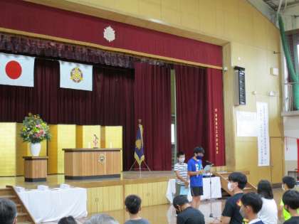式の後半は、児童代表のことば、児童への記念品贈呈、そして150周年にむけ児童から募集したキャッチコピーやイベント案で、校長賞を始めいろいろな賞を受賞した人の授賞式が行われました。