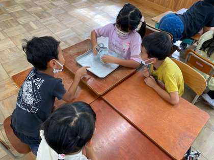 2つの容器でどちらが多く入るのか水を移して調べました。