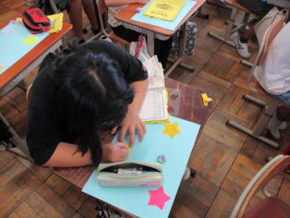 事前の学習から,山の家での2日間を通して,同じグループで活動した友達の良いところを見つける取組をしていました。カードにまとめてプレゼントする予定です。