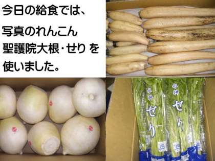 「聖護院大根」は蕪のような丸い形の大根です。煮ると大変柔らかくなり、味がしみ込みやすく、とろけるような口あたりです。左京区の聖護院地区で生まれたことからこの名前がつきました。江戸時代、尾張の国(今の愛知県)からもらった大根を大切に育てているうちに丸くなったそうです。今日はハート型の幸せにんじんが入っていました。
