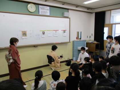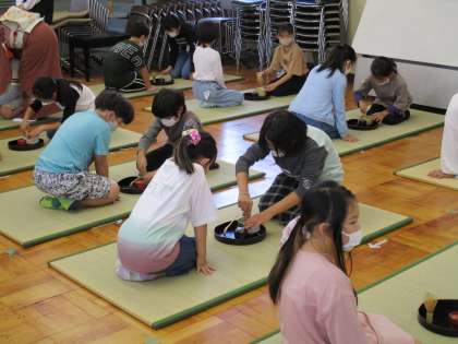 今年度文化庁の京都への全面移転を契機に、小学校では文化体験として「茶道体験」を毎年実施することになりました。本校では、10月14日(金)に4年生で実施し、当日は茶道の先生をお招きし、茶道の歴史を学んだり、実際にお茶を点てる体験を行いました。子どもたちは、作法を始めお茶を点てることも初めての経験で、自分で点てたお茶をそれぞれ味わって飲んでいました。