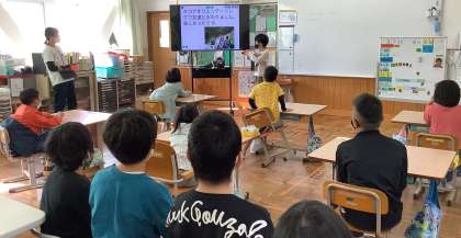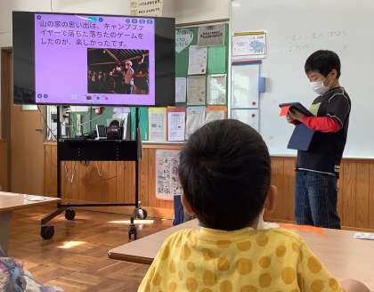 5年生が,山の家の活動を振り返り,楽しかったことを1〜4年生に発表しました。