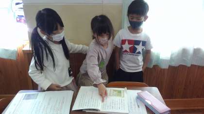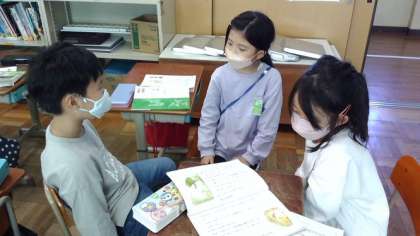 国語の「お手紙」の学習で,班に分かれて音読の工夫を考えました。身振り手振りを付けて,登場人物になりきって練習しています。どんな音読劇になるのか,とても楽しみです。