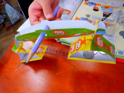9月に算数科で『重さ』の学習をしました。教科書に付いている「てんびん」を組み立て、文房具や1円玉を使って重さ比べをしました。三角定規が、1円玉で何個分の重さになるか調べました。