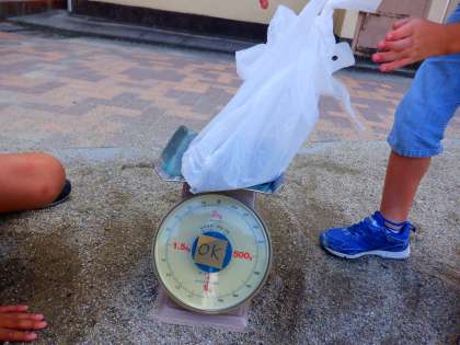 算数科『重さ』の学習で、1kgの重さをつくりました。1kgと思う重さだけ、ふくろに砂を入れてはかりでたしかめてみました。子どもたちは、手に持って重さの感じを実感していました。