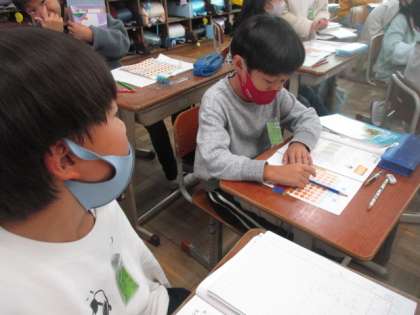 算数の「かけ算(2)」の学習で,アレイ図を使って掛け算の問題を出し合いました。九九をすらすら言うことができるように,九九の練習も頑張ろうね!