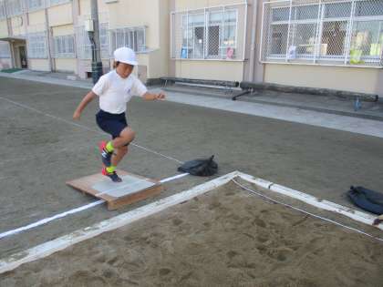 適切な助走距離を考えたり,より遠くまで跳ぶにはどのようにしたら良いかを話し合ったりしています。