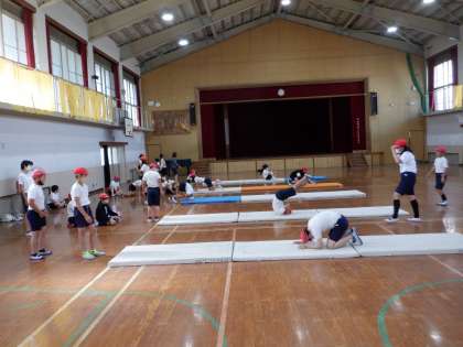 体育科「マット運動」の学習で,連続技に取り組んでいます。開脚前転や開脚後転,側転など,これまでに身に付けた技を組み合わせて連続技を考えます。できる技をよりきれいに,できる技をよりたくさんを目標に頑張っています。