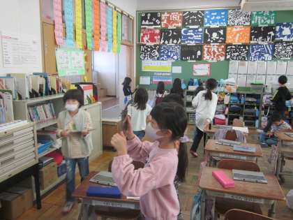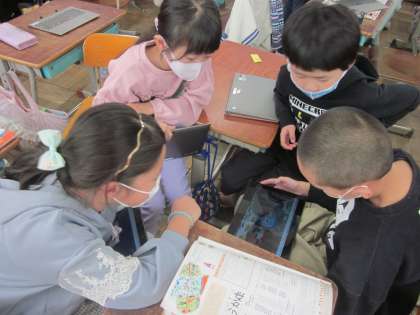 学校にある顔に見える形を探しました。今回は教室の中で,次回は東の森で探します。見つけた友だち(顔に見える形)はタブレットでカメラに撮って,友だちに紹介しました。画像を指さしながら,「これが目で,これが口」と説明し,「見える〜!」と楽しそうに交流していました。普段の何気ない風景に,友だちが隠れていると思うと,おもしろいですね。
