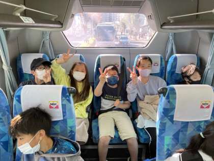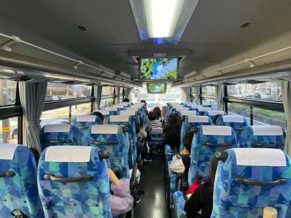 社会見学へ出発です。貸切りのバスで移動しました。感染症拡大防止ということもあり,車内での会話は控えました。その代わり,バスの中では景色を見たり、ビデオを静かに鑑賞したりしました。
