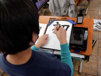 書写の学習で,『初春』という字を書きました。まだ,書き初めの季節ではありませんが,作品展に向けての練習です。自分の作品と見本とを見比べて,筆の運びを確認したり,何度も書き直す姿が多く見られました。