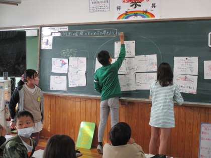 この日の学習は「ひし形」の面積の求め方をみんなで考えました。既習の内容と結び付けながら,4つの三角形に分けたり,大きな長方形と考えたりと様々な意見が出ましたが,その共通点に気付き,「対角線×対角線÷2」という公式に辿り着くことができました。