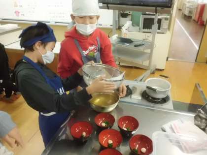 「自分たちも作りたい!」ということでだしをひいて吸地をつくり,ほうれん草と手まり麩の入ったお吸い物づくりにチャレンジしました。