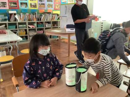 秋みつけで集めた葉っぱなどをつかったランタンが完成しました。