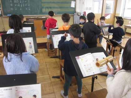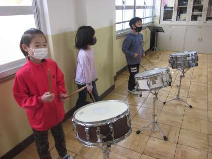 好きな打楽器を選んで,好きなリズムを演奏して,「おはなし」します。カスタネット,トライアングル,タンブリン,ウッドブロック,クラベス,すず,小だいこの音色がいろいろなリズムを奏でることで楽しい会話ができました。
