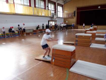 体育科で,とび箱の学習がはじまりました。助走から着地まできれいにを目標に,徐々に段数を増やしていければと思います。
