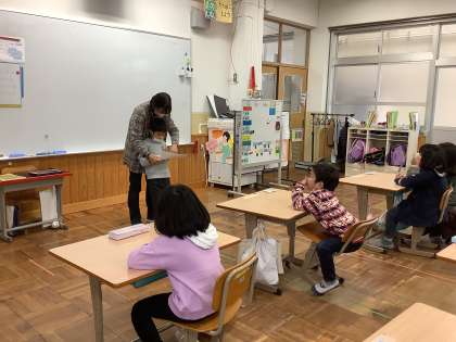 「動きの言葉」や「反対言葉」など,イラストやフラッシュカードをながら学習しています。最近,新しく「様子を表す言葉」の学習に入りました。「黄色い〇〇」といったワードをお題に出し,教室の中から探して紹介するといった活動をしています。