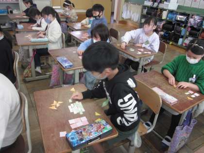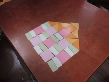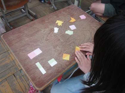 長方形・正方形・直角三角形の3種類の形をしきつめて,もようづくりに取り組みました。教科書のお手本を見てマネをすることから始めて,最後は自分で組み合わせていろいろなもようができあがっていました。
