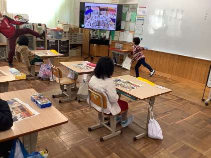 12日(月)にみんなで国語をしました。ジェスチャーで動きの言葉を伝え,絵の中から探しました。特徴をとらえて上手に伝えています。先日のポップコーンの調理について書いた作文の発表もしました。調理の時の音やにおい,味など五感を使って表現できました。