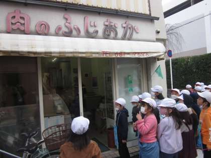 3回目のまちたんけんはりんごコースです。唯一、歩道橋があるコースです。そして行ったことがある子どもが多いイオンがあるコースです。歩道橋の上からお好み焼き屋さんや新しくできたスーパーが見えると、「前に家族と行った!」と興奮気味の子どもたち。1学期のまちたんけんの時にインタビューに行かせてもらったお肉屋さんの前に来ると、待ってましたと言わんばかりに店の中をのぞき込む子どもたちでした。