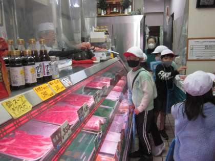 お肉屋さんのご厚意で、中に入らせてもらいました。お肉の他にもいろいろなものを売っていることや、肉をはかりにのせて値段をつけている様子に興味津々の様子でした。