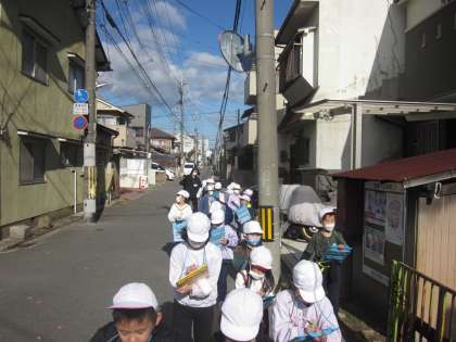 まちたんけんの最後は「ももコース」です。ももコースが通学路の子どもが一番多いので、まちの様子を知っている子どもたちがたくさんいました。よく利用している西浦東公園と竹尻公園も通ったので嬉しそうにしていました。