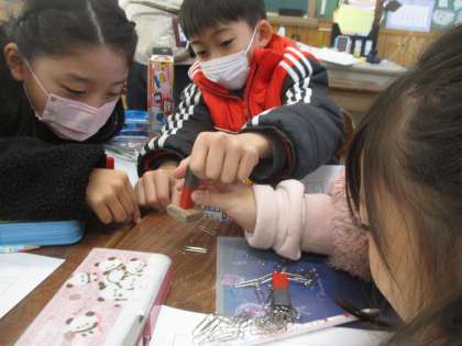 今日は,磁石とクリップの間に段ボールを挟み,どれぐらいクリップを引きつけるかで調べました。