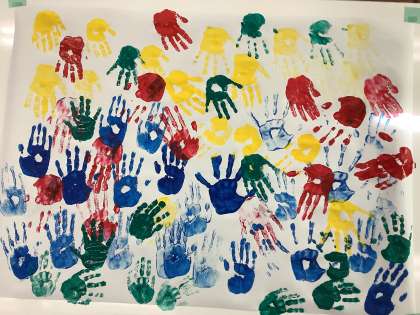 図工の時間で2つの活動をしました。1つめは,みんなで手形を押して大きな絵を描きました。手に絵の具を塗るときは,心配そうな子どもたちも,手形を押すと楽しくなってきたようでした。