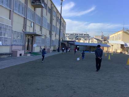 2つめは,ビニール袋の凧です。取っ手付きのビニール袋にひもをつけてそれぞれ好きな絵を描きました。何度も何度も走って凧を上げました。