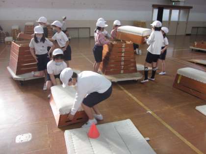 とびばこ遊びの学習が始まりました。用具を使う学習は準備と片づけが重要です。けがをしないように気をつけながら友達と力を合わせて取り組んでいます。安全に素早く準備と片づけができれば,活動の時間がたくさんとれます。久しぶりのとびばこ遊びの後は,みんな「楽しかった〜」と笑顔があふれていました。